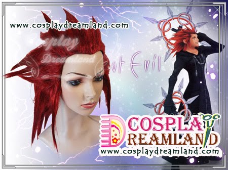 Like other Organization members, Axel wears the basic black gloves and boots. His black coat, however, is one of the more distinctive ones in the group, as its sleeves close up tightly around his arms. Axel himself is also easily distinguishable from other characters in terms of facial features, made easier by the fact that he rarely wears the hood of his coat up. Axel has rather small eyebrows and thick, shoulder-length, bright red hair styled into slicked-back spikes. His eyes are a bright emerald color and he has a purple reverse-teardrop shaped marking under each eye.